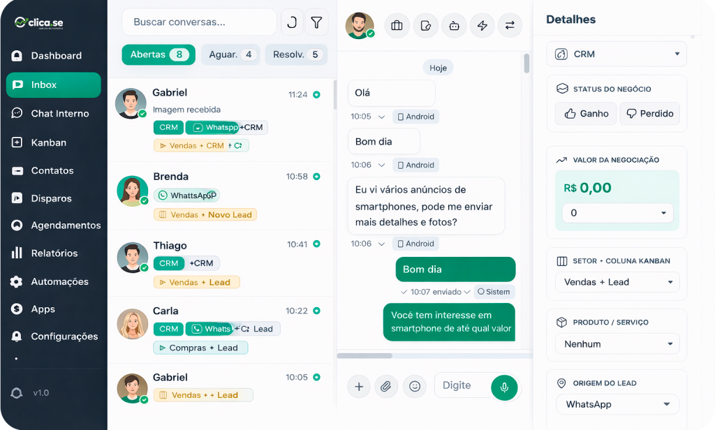 Gerencie clientes do WhatsApp, Instagram e Facebook em um só lugar. Pipeline de vendas, histórico completo e tags inteligentes.